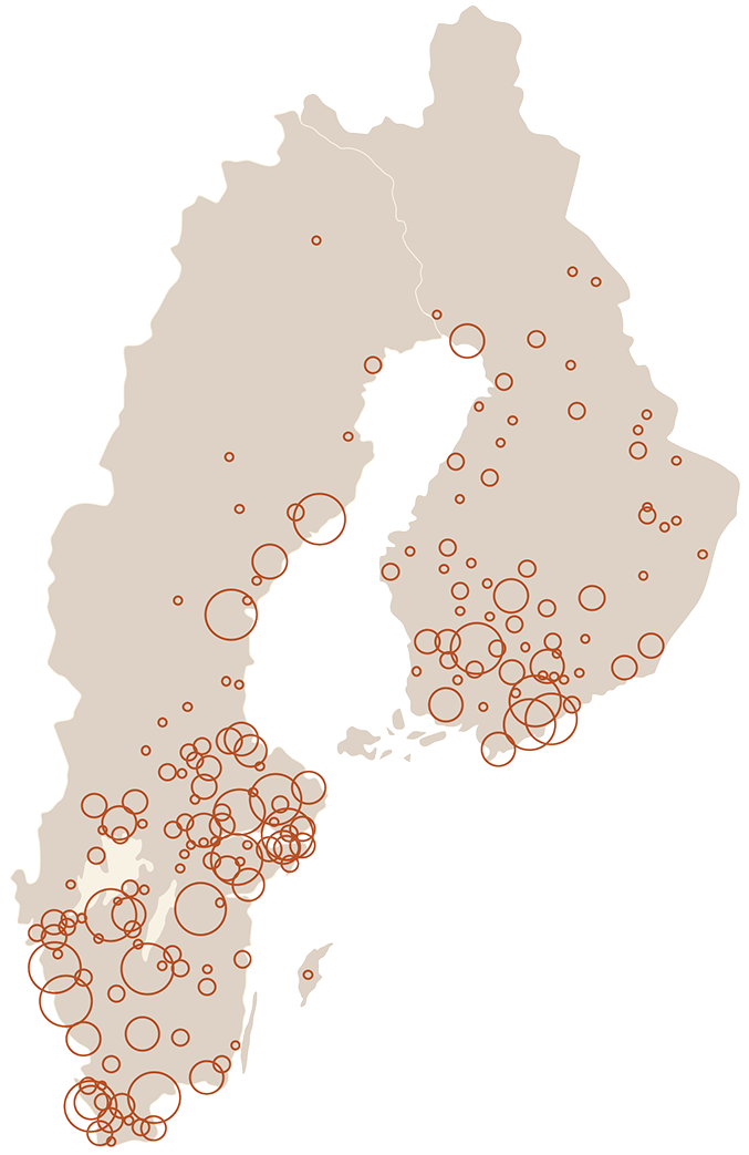 Storleken på respektive markering är baserad på hur stort fastighetsvärde Trophi har i respektive kommun.