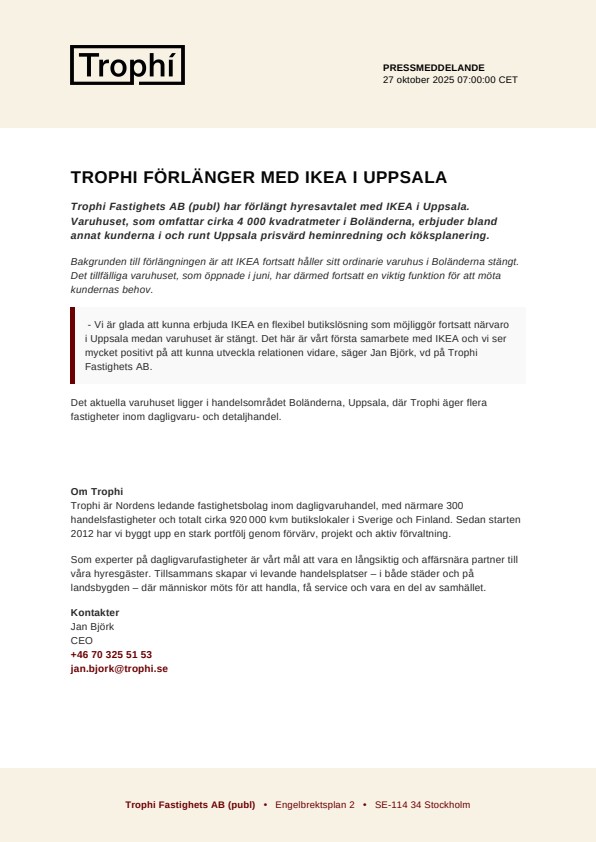 Trophi Fastighets AB (publ) har förlängt hyresavtalet med IKEA i Uppsala. Varuhuset, som omfattar cirka 4 000 kvadratmeter i Boländerna, erbjuder bland annat kunderna i och runt Uppsala prisvärd heminredning och köksplanering.