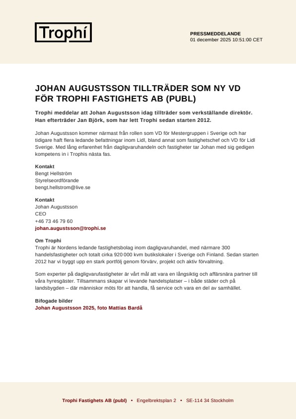 Johan Augustsson kommer närmast från rollen som VD för Mestergruppen i Sverige och har tidigare haft flera ledande befattningar inom Lidl, bland annat som fastighetschef och VD för Lidl Sverige. Med lång erfarenhet från dagligvaruhandeln och fastigheter tar Johan med sig gedigen kompetens in i Trophis nästa fas.