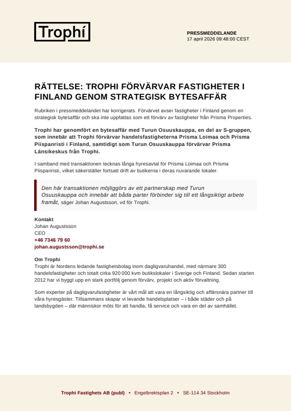 Trophi har genomfört en bytesaffär med Turun Osuuskauppa, en del av S-gruppen, som innebär att Trophi förvärvar handelsfastigheterna Prisma Loimaa och Prisma Piispanristi i Finland, samtidigt som Turun Osuuskauppa förvärvar Prisma Länsikeskus från Trophi.