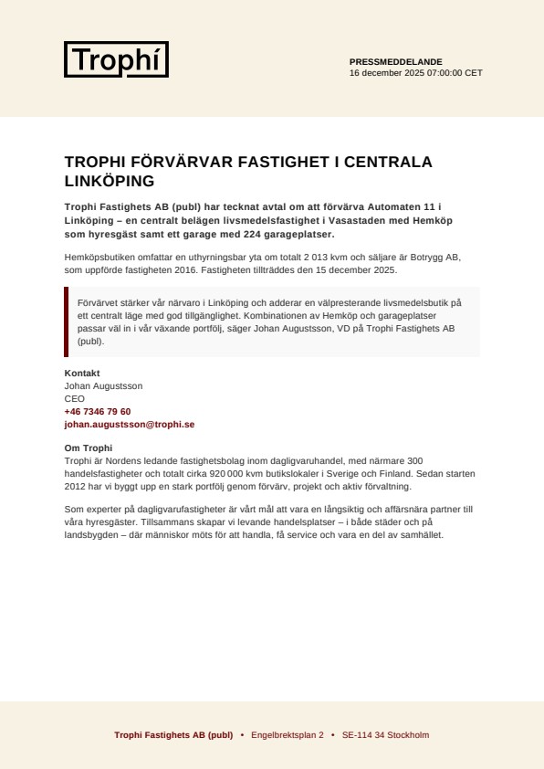 Förvärvet stärker vår närvaro i Linköping och adderar en välpresterande livsmedelsbutik på ett centralt läge med god tillgänglighet. Kombinationen av Hemköp och garageplatser passar väl in i vår växande portfölj, säger Johan Augustsson, VD på Trophi Fastighets AB (publ).