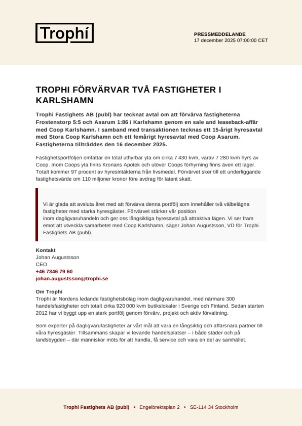 Trophi Fastighets AB (publ) har tecknat avtal om att förvärva fastigheterna Frostenstorp 5:5 och Asarum 1:86 i Karlshamn genom en sale and leaseback-affär med Coop Karlshamn. I samband med transaktionen tecknas ett 15-årigt hyresavtal med Stora Coop Karlshamn och ett femårigt hyresavtal med Coop Asarum. Fastigheterna tillträddes den 16 december 2025.