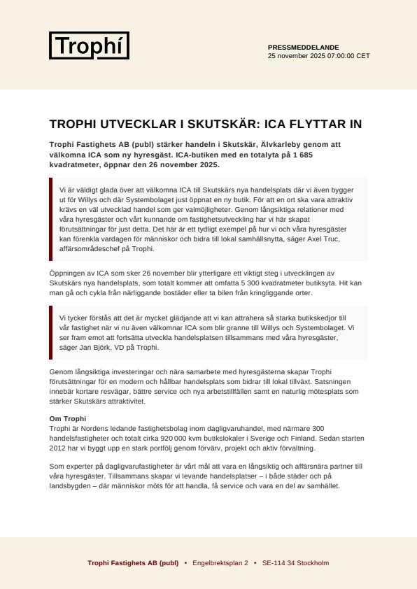 Trophi Fastighets AB (publ) stärker handeln i Skutskär, Älvkarleby genom att välkomna ICA som ny hyresgäst. ICA-butiken med en totalyta på 1 685 kvadratmeter, öppnar den 26 november 2025.