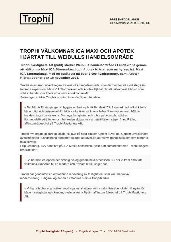 Trophi Fastighets AB (publ) stärker Weibulls handelsområde i Landskrona genom att välkomna Maxi ICA Stormarknad och Apotek Hjärtat som ny hyresgäst. Maxi ICA Stormarknad, med en butiksyta på över 6 000 kvadratmeter, samt Apotek Hjärtat öppnar den 19 november 2025.
